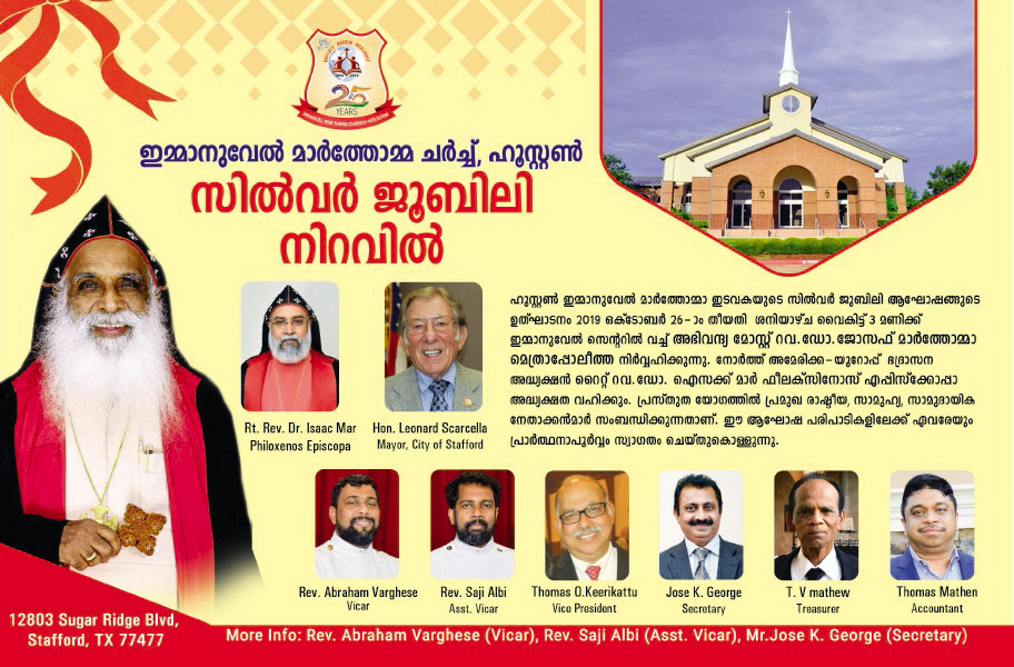 ഹൂസ്റ്റൺ: മാർത്തോമാ സഭയുടെ നോർത്ത് അമേരിക്ക-യൂറോപ്പ് ഭദ്രാസനത്തിലെ ഏറ്ററ്വും വലിയ ഇടവകകളിലൊന്നായ ഇമ്മാനുവേൽ മാർത്തോമാ ഇടവകയുടെ ഒരു വർഷം നീണ്ടുനിന്ന രജത ജൂബിലി ആഘോഷങ്ങൾക്ക് പരിസമാപ്തി കുറിച്ചുകൊണ്ട് നടത്തപ്പെടുന്ന ജൂബിലി സമാപന പരിപാടികളുടെ ഒരുക്കങ്ങൾ പൂർത്തിയതായി ഇടവക ഭാരവാഹികൾ അറിയിച്ചു.
