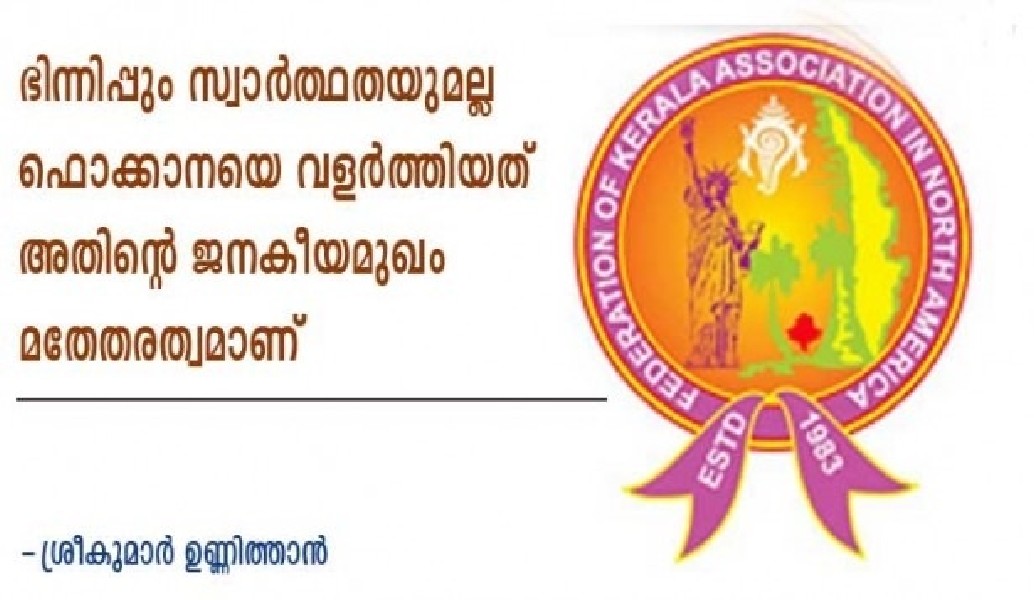 ഇവിടെ മലയാളികള്ക്കു ഭിന്നിപ്പും സ്വാര്ത്ഥമായ സംഘടിക്കലുമല്ല യുക്തമായത്. ഒരു തരത്തിലുള്ള അതിരുമല്ലാത്ത ഒരു സംഘടിതശക്തിയായി മാറുകയാണ് വേണ്ടത്.അത് മനസ്സിലാക്കി പ്രവർത്തിക്കാൻ നമുക്ക് ഇനിയും കഴിയണം . അതിരുകൾക്കും വിഭാഗീയതകള്ക്കും എതിരെ ഒരു ശബ്ദമാകാൻ കഴിഞ്ഞത് പല സംഘനകൾക്കും ഒരു മാതൃകയായി മാറാനായത് .ചുരുക്കിപ്പറഞ്ഞാല് അമേരിക്കന് മലയാളികളുടെ സംഘടിതശക്തിയ്ക്കും സംഘടനതാല്പര്യത്തിനും നിമിത്തമായത് ഫൊക്കാനയാണ്.